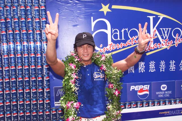 城城舉起勝利手勢,好似贏了冠軍咁,認真威水!