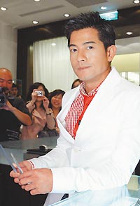 昨天東區飄雨,澆不息粉絲熱情,郭富城白西裝、粉白格子配鮮紅領帶,完全時尚型男裝扮,和法國眼鏡設計師Alain Mikli一起剪綵,設計師要感謝親吻他時,還引起粉絲大叫。