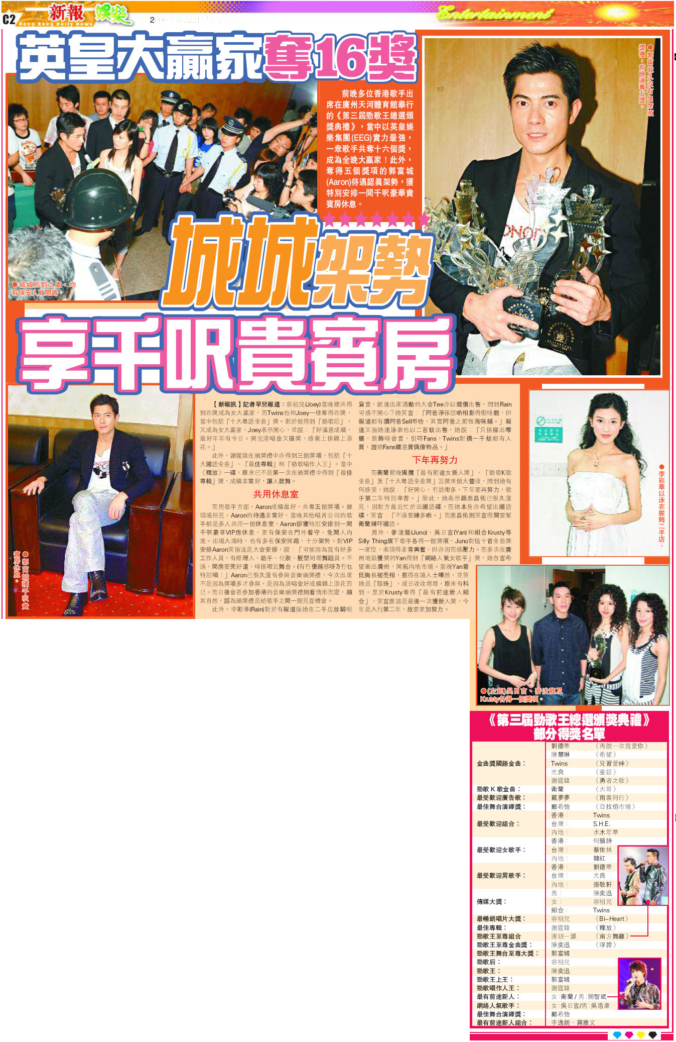 前晚多位香港歌手出席在廣州天河體育館舉行的《第三屆勁歌王總選頒獎典禮》,當中以英皇娛樂集團(EEG)實力最強,一眾歌手共奪十六個獎,成為全晚大贏家﹗此外,奪得五個獎項的郭富城(Aaron)待遇認真架勢,獲特別安排一間千呎豪華貴賓房休息。