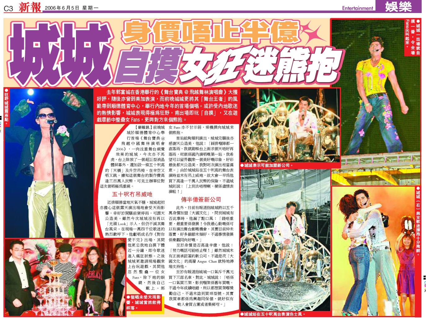【新報訊】前晚城城於順德體育中心舉行首場《舞台寶典@飛越中國舞林演唱會2006》,一向注重舞台視覺效果的城城,今次亦不馬虎,台上除放了一個超巨型液晶體屏幕外,還加設一條五十呎高的「天橋」及升空吊椅,在半空又唱又跳。據知這個舞台的製作費高達三百萬人民幣,可見主辦單位對這次個唱極為重視。
