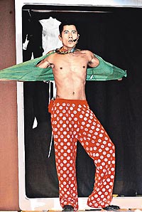 「四大天王」郭富城昨晚在香港紅館舉行的「MOOV歌舞會」再度讓歌迷High翻天!壓軸演出的郭富城,身著睡衣、睡帽和毛毛拖鞋,躺在毛毛床空降舞台中央,他不斷勁歌熱舞,還模仿亞洲小天王Rain台上撕爆背心,露出六塊結實的腹肌,讓現場歌迷尖叫聲連連。