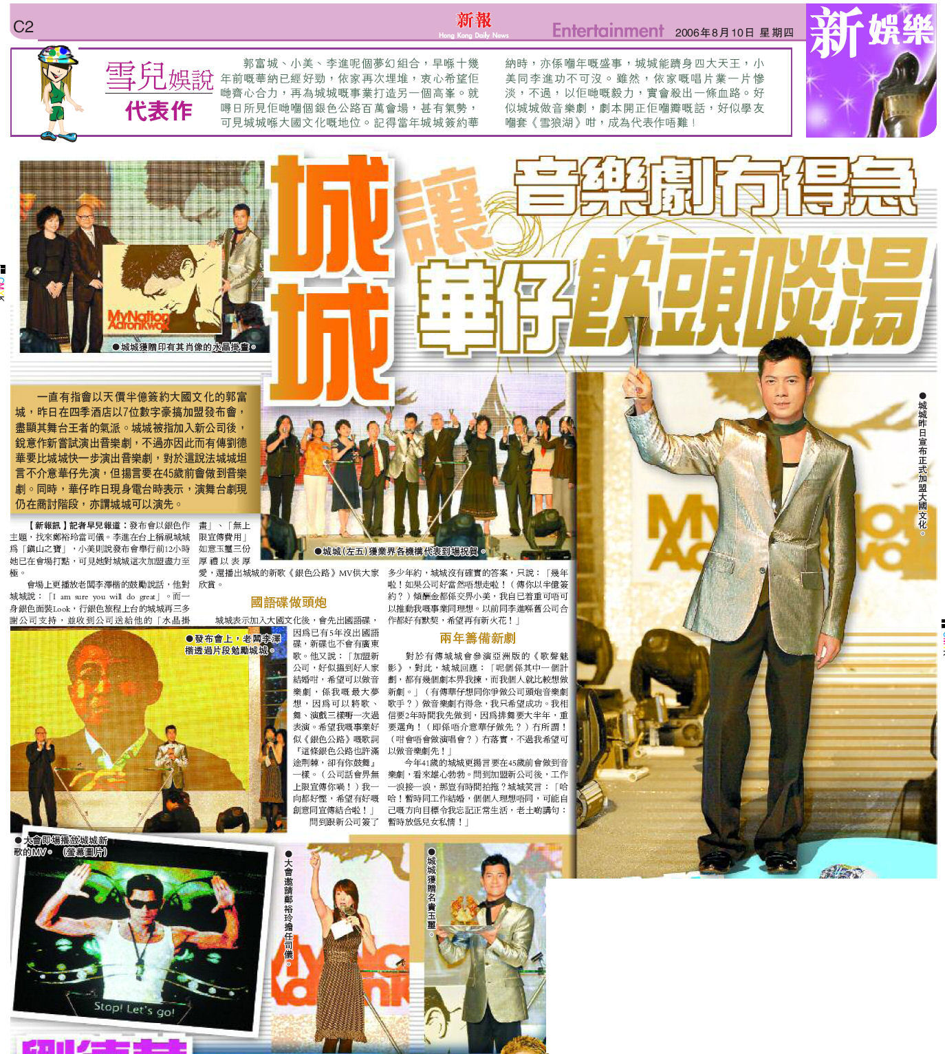 對於有傳城城會參演亞洲版的《歌聲魅影》,對此,城城回應﹕「呢個係其中一個計劃,都有幾個劇本畀我揀,而我個人就比較想做新劇。」(有傳華仔想同你爭做公司頭炮音樂劇歌手﹖)做音樂劇冇得急,我只希望成功。我相信要2年時間我先做到,因為排舞要大半年,重要選角﹗(即係唔介意華仔做先﹖)冇所謂﹗(咁會唔會做演唱會﹖)冇落實,不過我希望可以做音樂劇先﹗」
