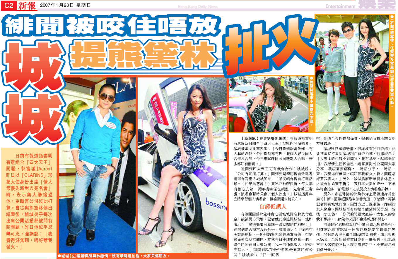 城城雖沒承認戀情,但亦沒有開口否認,記者狂追猛打追問城城現在有否拍拖,他即表示﹕「大家圍繞住熊小姐問我,我冇承認、默認過拍拖,我感情生活係自己,唔需要對外公開同大家分享,我唔需要解釋,一時話分手,一時話一齊,我覺得好無聊,唔好惹我發火,總之問題唔好惹我發火。」另外,城城農曆新年將會休息,之後會拍攝寰宇新片,五月再去美加登台,下半年將會拍多一部電影,之後便投入演唱會排練。