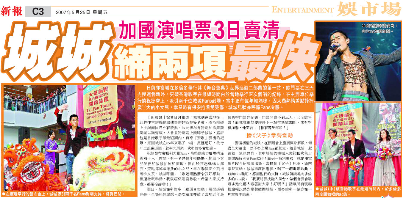 日前郭富城在多倫多舉行其《舞台寶典》世界巡迴二部曲的第一站,除門票在三天內極速售罄外,更破香港歌手在最短時間內於當地舉行兩次個唱的紀錄。在主辦單位舉行的祝捷會上,吸引兩千位城城Fans到場,當中更有位年輕媽咪,因太過熱情差點摔掉歲半大的小女兒,幸及時有保安抱荍K受傷,城城見狀亦呼籲Fans冷靜。