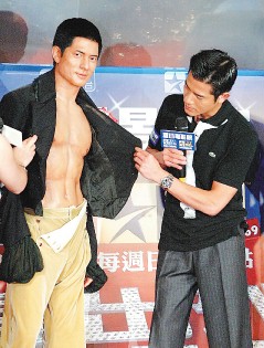 在台北市西門鬧區今日數位影城4樓展出的郭富城蠟像,衣服是他2004年「舞台寶典」演唱會,由張叔平設計的一襲釘有綻放鮮花裝飾的黑色鬆身外套連褲,蠟像比現在的郭富城還要瘦。郭富城開玩笑掀開蠟像上衣,秀出蠟像上六塊肌展現傲人身材,不過衣服掀太開,蠟像「露點」,郭富城趕緊說:「那是『假點』」,引來大笑。