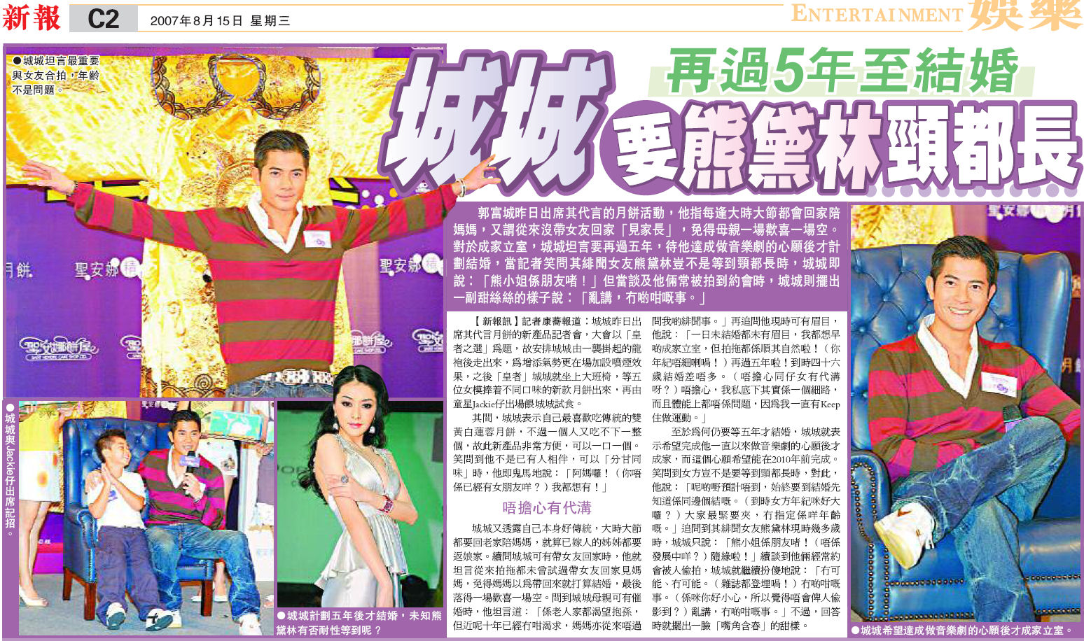 郭富城昨日出席其代言的月餅活動,他指每逢大時大節都會回家陪媽媽,又謂從來沒帶女友回家「見家長」,免得母親一場歡喜一場空。對於成家立室,城城坦言要再過五年,待他達成做音樂劇的心願後才計劃結婚,當記者笑問其緋聞女友熊黛林豈不是等到頸都長時,城城即說﹕「熊小姐係朋友隉T」但當談及他倆常被拍到約會時,城城則擺出一副甜絲絲的樣子說﹕「亂講,冇鑨翵ヾC」