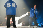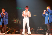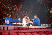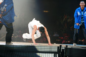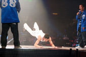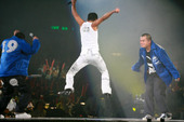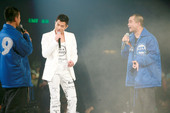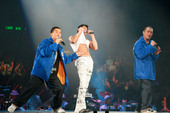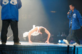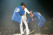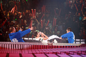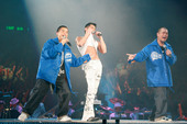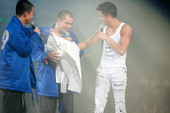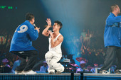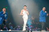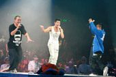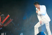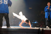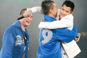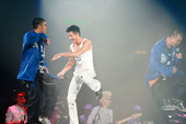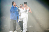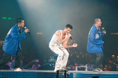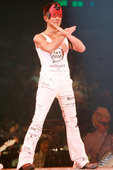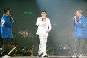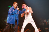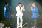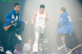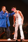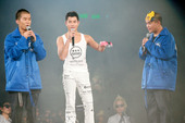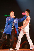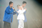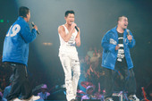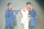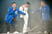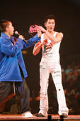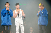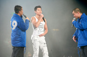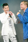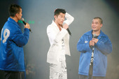 [08月05日香港讯]晚上八时三十分,红馆,一连十场的软硬演唱会终於告一段落,当晚不少圈中朋友出席捧场,包括:彭羚、袁咏仪、张智霖、杨千嬅、苏永康、莫文蔚、古巨基、林珊珊…等等。最后一场演出中,软硬特别请来部富城担任嘉宾,他们以当於舞台王者介绍城城出场,一身白马王子打扮的城城,出场献唱『狂野之城』,唱罢之后,城城便表示,「大家友情唔使讲啦,JAN就帮我演唱会讲旁白,十分感人,阿葛就帮我客拍MV,又帮我设计屋企。」此时阿葛便踢爆城城的家居秘密,指城城屋企浴室好大,可以让人助跑,而浴缸就要游两下才可去得到,花瀟就十足热带雨林般,而且更有一个大镜,给城城边冲凉边照镜用的。城城笑指阿葛越爆越多了,继而他就踢爆阿JAN,指阿JAN在开骚前,想操弗些,於是便致电给他,叫他介绍教练,城城即场叫阿JAN除衫骚肌肉 ,JAN笑指自己这些后辈,岂敢在前辈面前献丑。城城反问他说,甚麼前辈呀?JAN即笑著解释,前面就叫前背,后面就叫后背,再落些就叫断背,城城即大讲有味笑话说,这裡应该叫宝贝。JAN又向城城问道,听闻城城迟些会做ARRON OF THE OPERA,继而二人便望著城城,并将改了歌词的THE PHANTOM OF THE OPERA唱出,之后他们再与城城合唱「强人」,软硬亦再改动歌词,藉以大讚城城靚仔又有钱。最后他们就跟城城合作跳出「对你爱不完」的舞步力城城突然卧地做SIT UP,令软硬跟不上,十分搞笑。