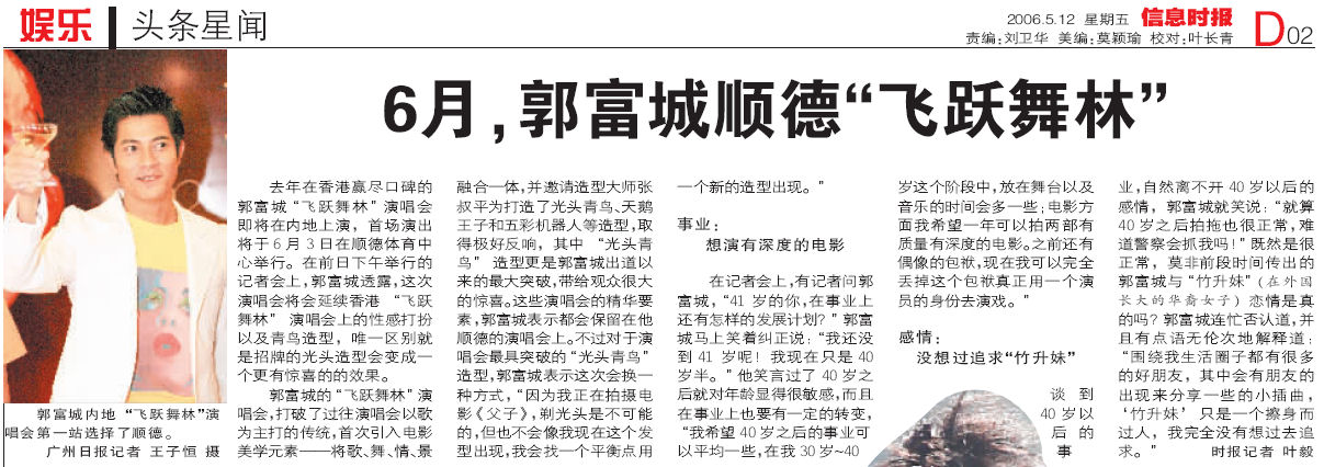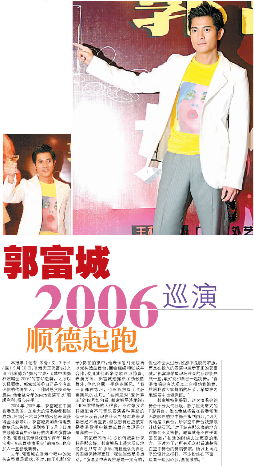 May 12 (a) - 6 月 , 郭 富 城 順 德 “ 飛 躍 舞 林 ” p1 (IT) (b) - 郭 富 城 2006 巡 演 順 德 起 跑 p1 (GZD) (c) - 郭 富 城 6 月 順 德 幵 唱 " 武 " 動 全 城 (NFD) (d) - 城 城 6 月 起 行 走 遍 中 國 辦 30 場 個 唱 (TEP) (e) - 郭 富 城 順 德 演 唱 會 玩 性 感 (YCWB)