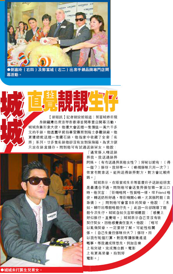 May 24 - 郭 富 城 劉 嘉 玲 「 浪 琴 錶 香 港 首 間 專 賣 店 開 幕 禮 」 HK-Image photos.. / CNS Photo.. - 2.. - 3.. - 4.. / Tungstar photos.. / XHN.. / SINA Video.. / TOM Video.. - 2.. / QQ Video.. (a) - 城 城 曾 送 表 女 友 p1 p2 (MPW) - (MP) (b) - 城 城 揀 靚 B 上 契 - 2.. (TKP) (c) - 城 城 直 覺 靚 靚 生 仔 (HKD) (d) - 城 城 坦 認 送 表 冧 女 - Clip (HLD) (e) - 城 城 嘉 玲 參 加 手 表 的 宣 傳 活 動 (AD) / (OD) / (SUN) / (STCA) (f) - 城 城 覺 得 靚 靚 會 生 仔 (SP) (g) - 城 城 賀 靚 靚 有 喜 送 奶 粉 (ST)
