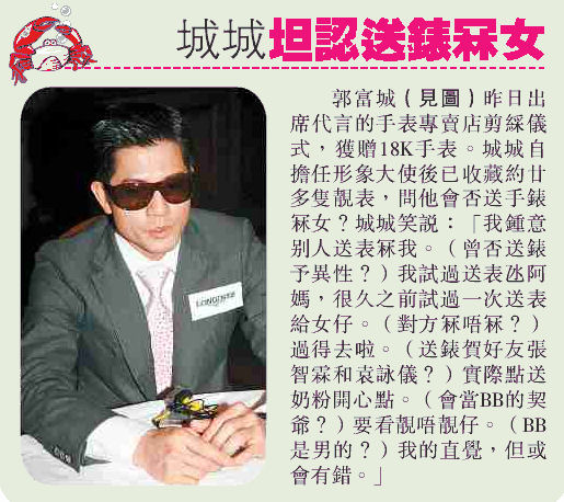 May 04 [1] - 城 城 型 仔 護 膚 品 廣 告 品 味 大 師 張 叔 平 精 心 打 造 形 象 Tungstar photos.. - SINA.. / TOM.. (a) - 郭 富 城 封 亞 洲 超 級 美 男 子 p1 p2 (MPW) - (MP) (b) - 城 城 廣 告 俊 臉 登 陸 法 國 (TKP) (c) - 城 城 拍 廣 告 睏 極 竟 入 睡 (WWP) (d) - 城 城 為 亞 洲 人 爭 光 (AD) (e) - 城 城 晉 身 國 際 護 膚 品 牌 代 言 人 (SP) (f) - 郭 富 城 為 亞 洲 人 爭 光 (CP) [2] (a) - 郭 富 城 駕 波 子 買 報 紙 (OD) / (UDN) / (WJ) (b) - 城 城 買 報 紙 駕 戰 車 紅 雨 照 頭 淋 (SUN)